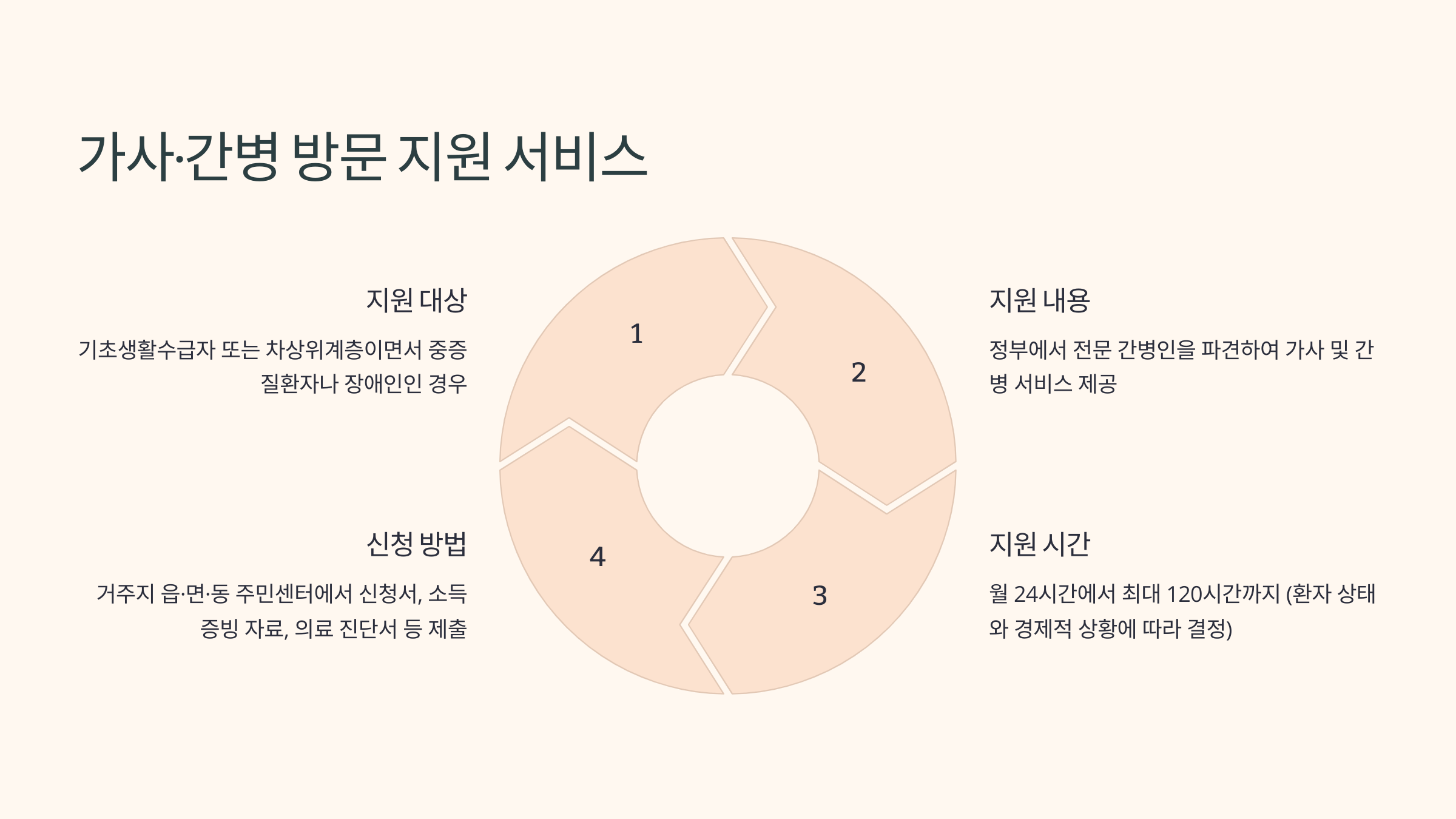 서비스 제공: 정부에서 전문 간병인을 파견하여 가사 및 간병 서비스를 제공합니다.
