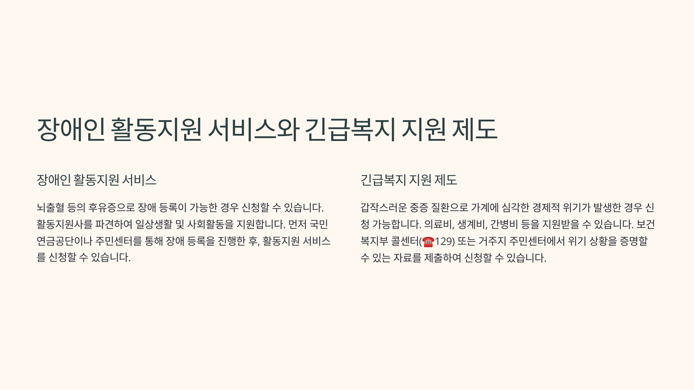 만약 환자분이 뇌출혈 등의 후유증으로 인해 장애 등록이 가능하다면, 장애인 활동지원 서비스를 통해 추가적인 지원을 받을 수 있습니다.