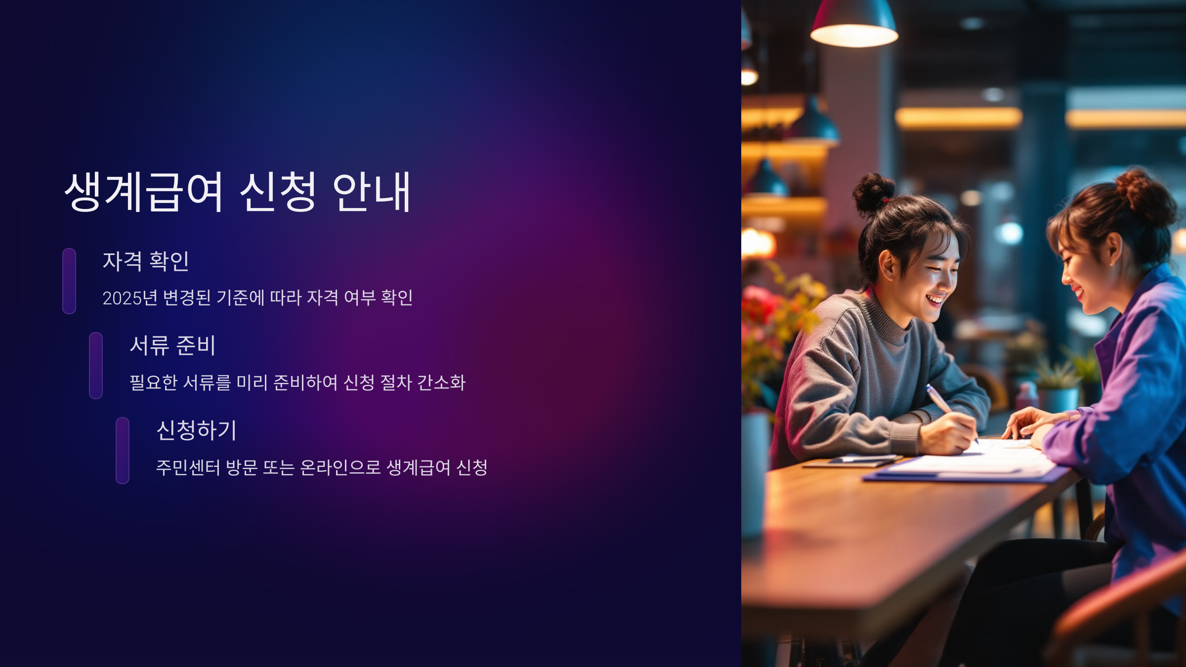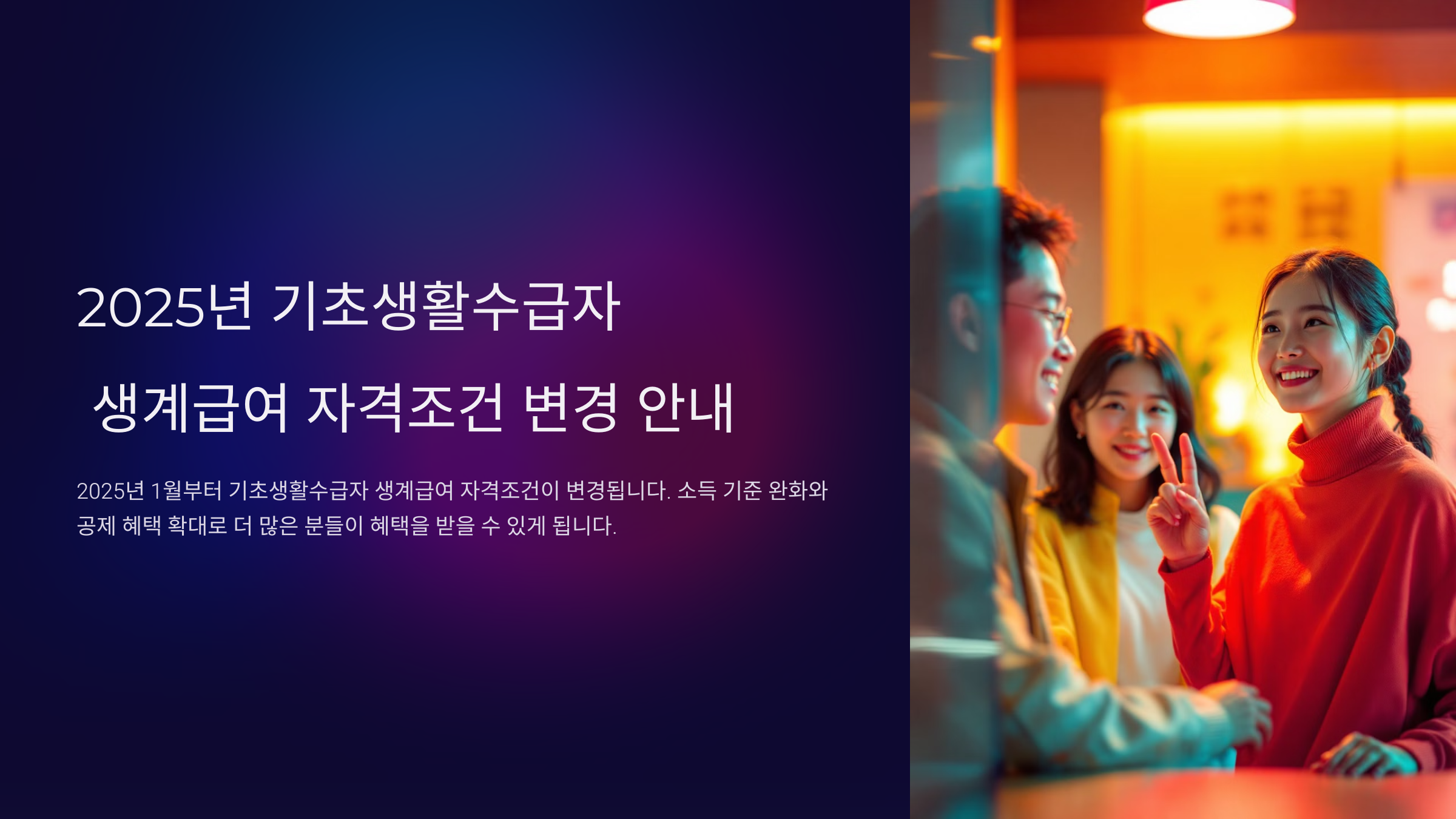 2025년 1월부터 달라지는 기초생활수급자 생계급여 자격조건에 대한 중요한 정보를 안내해 드리겠습니다.