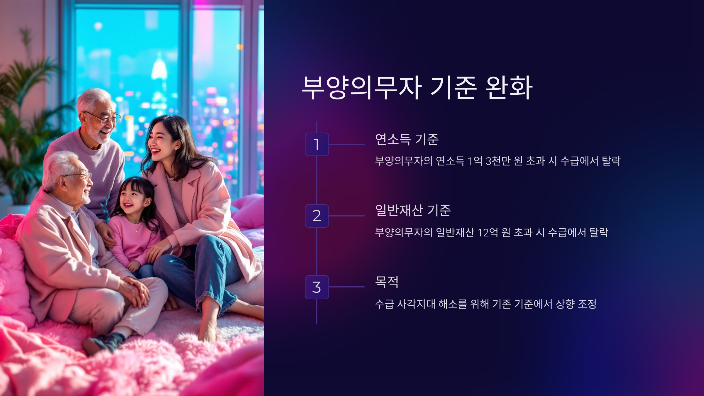 생계급여 부양의무자 기준도 완화되어, 2025년 1월부터 부양의무자의 연소득 1억 3천만 원 또는 일반재산 12억 원 초과 시 수급에서 탈락하게 된다.