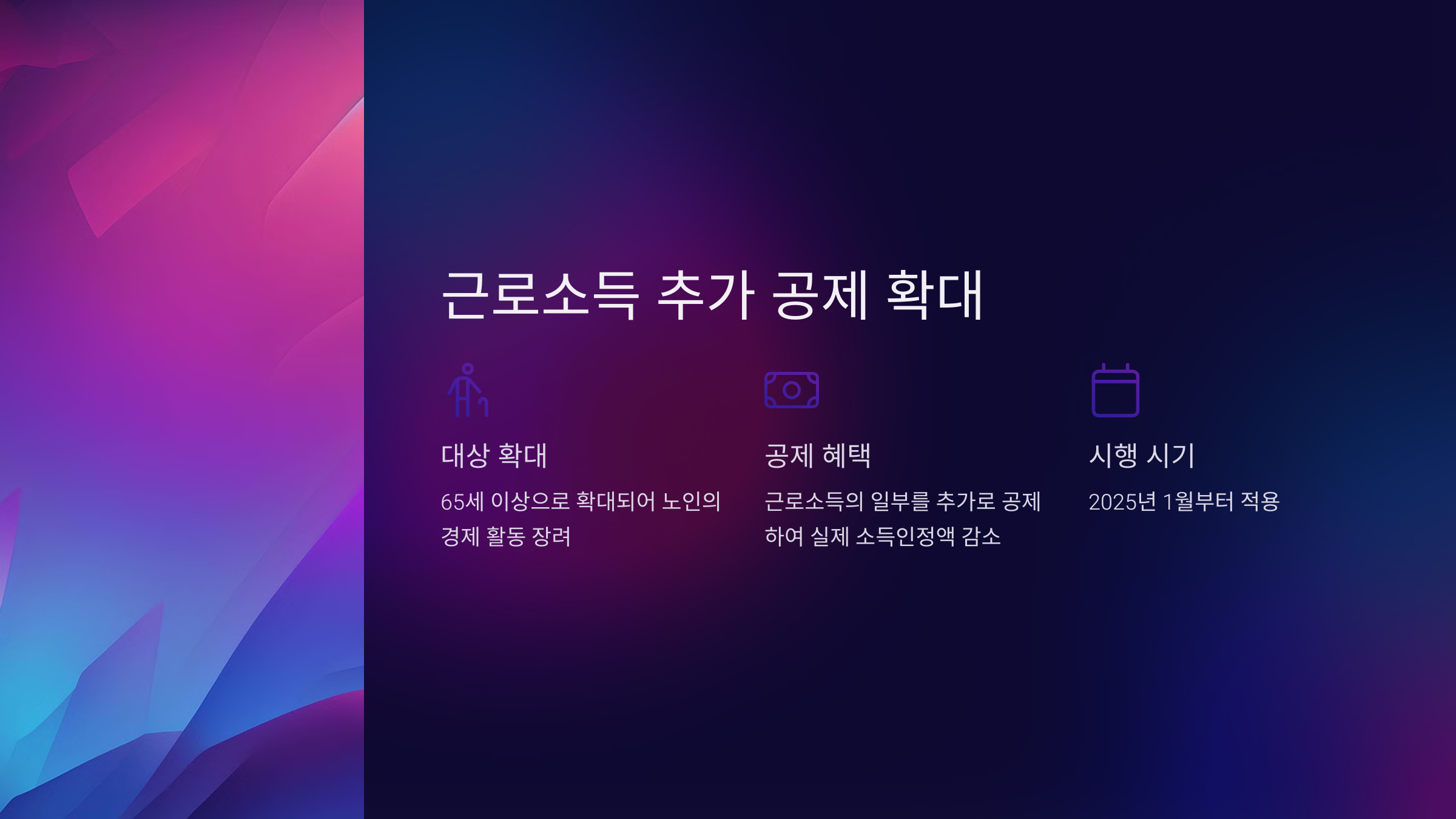 2025년 1월부터 근로소득 추가 공제 적용 대상이 65세 이상으로 확대되어 노인의 경제 활동을 장려한다.