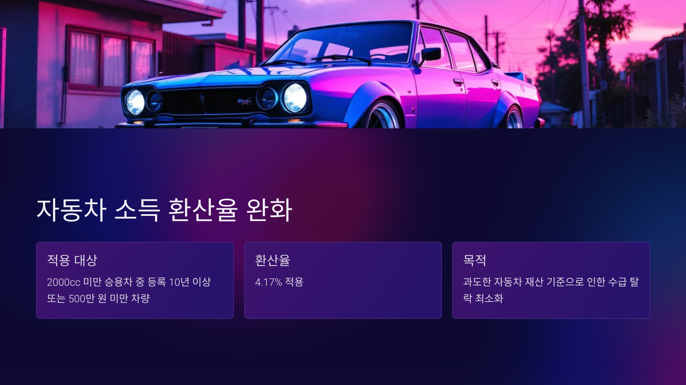 2025년부터 자동차 소득 환산율 4.17% 적용 기준이 완화되어, 2000cc 미만 승용차 중 등록 10년 이상 또는 500만 원 미만 차량에 적용된다.