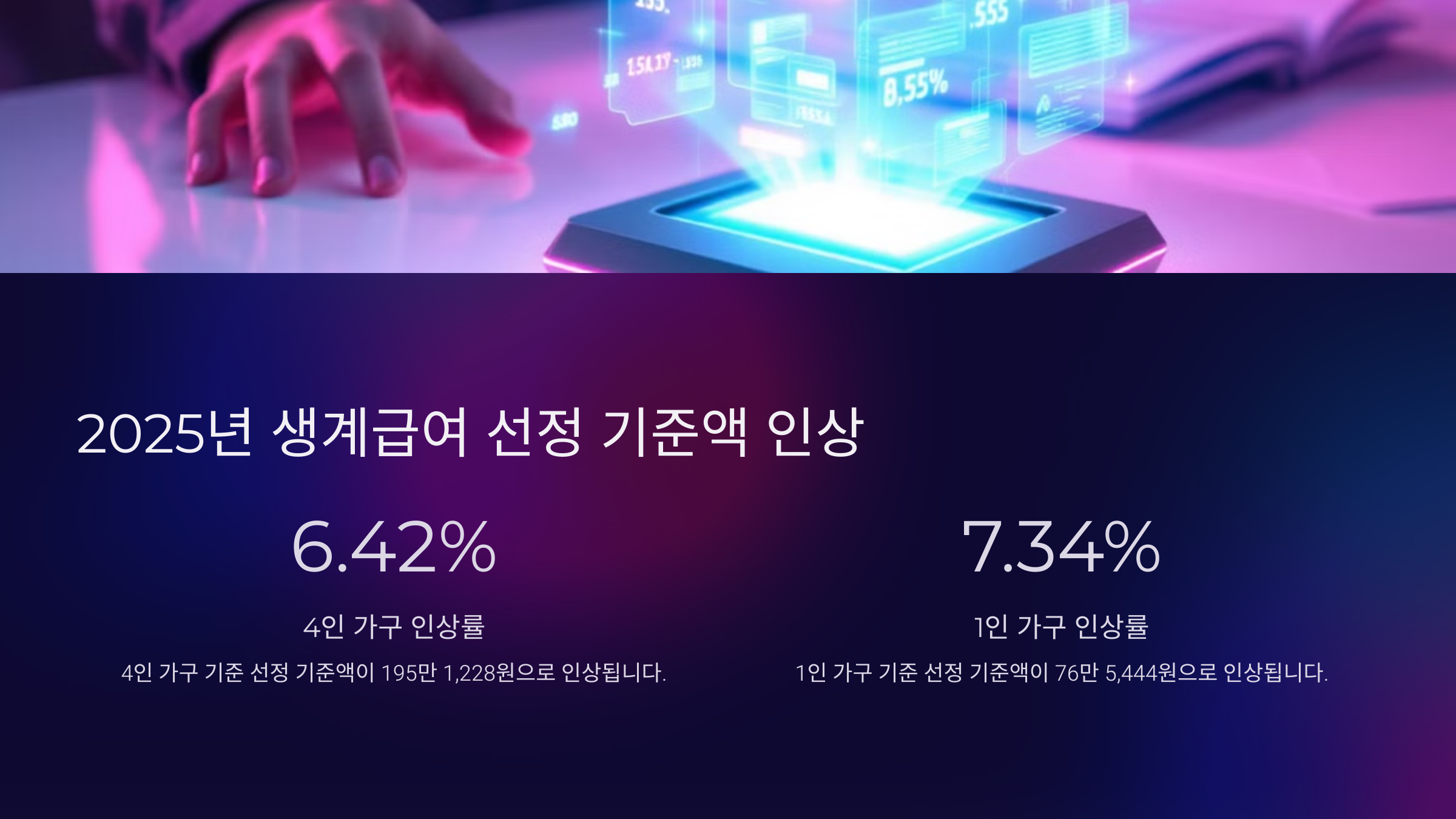 4인 가구 기준 선정 기준액은 2024년 183만 3,571원에서 2025년 195만 1,228원으로 6.42% 인상된다.