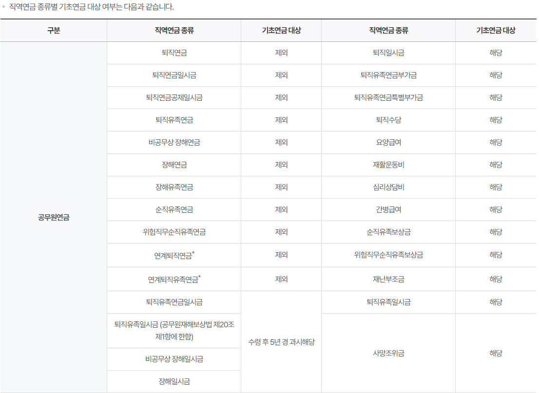 • 공무원연금, 사립학교교직원연금, 군인연금, 별정우체국연금 수급권자 및 그 배우자는 원칙적으로 기초연금 수급대상에서 제외됩니다.
