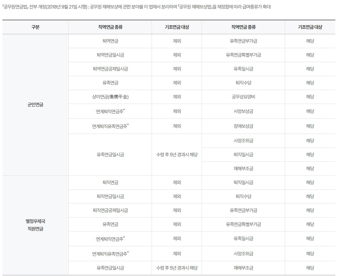 - 직역(공무원·사립학교교직원·군인·별정우체국직원) 재직기간이 10년 미만인 국민연금과 연계한 연계퇴직연금 또는 연계퇴직유족연금 수급권자 및 배우자