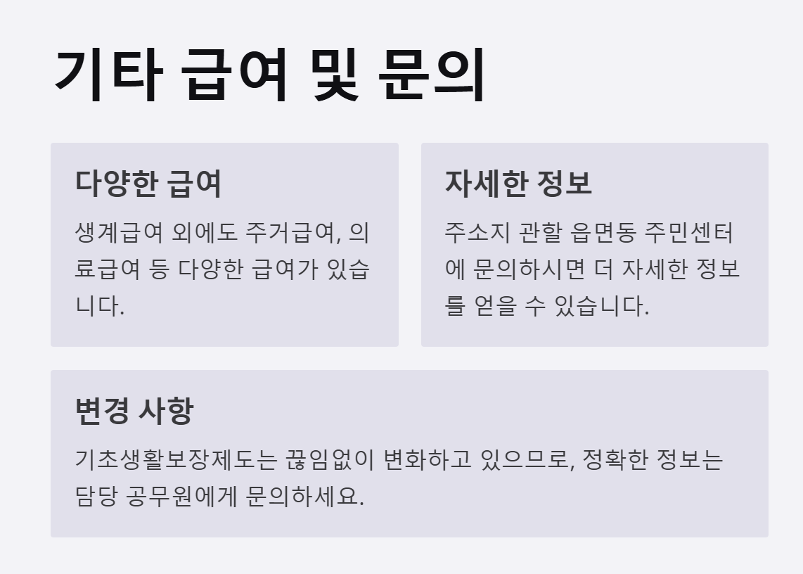 생계급여 외 다른 급여: 주거급여, 의료급여 등 다양한 급여가 있습니다.