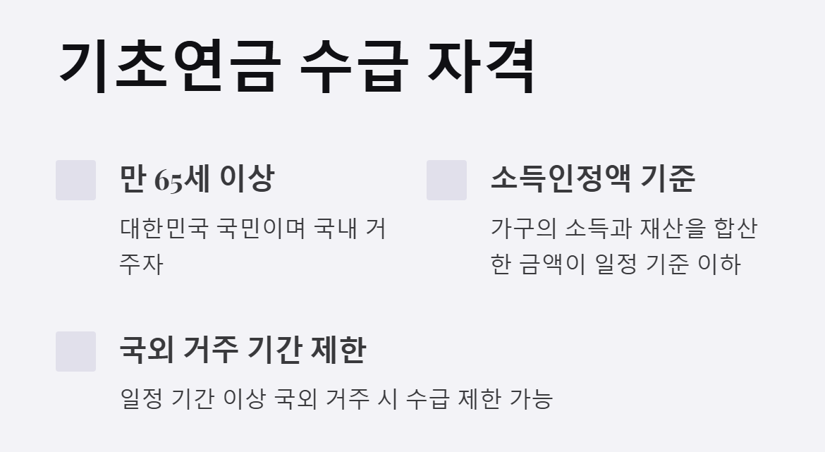 국외 거주 기간 제한: 일정 기간 이상 국외에 거주한 경우 수급이 제한될 수 있습니다.