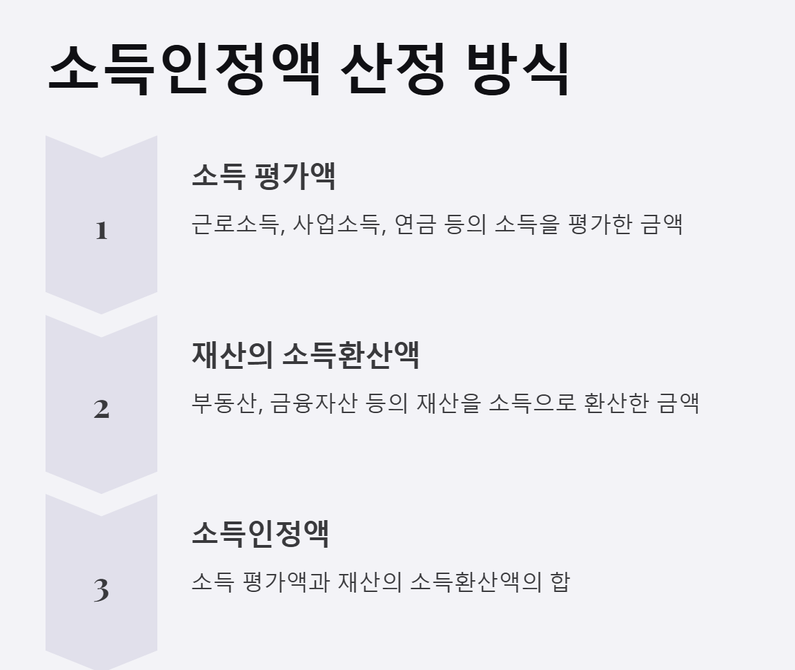 재산의 소득 환산: 부동산, 금융자산 등을 소득으로 환산하여 소득과 함께 평