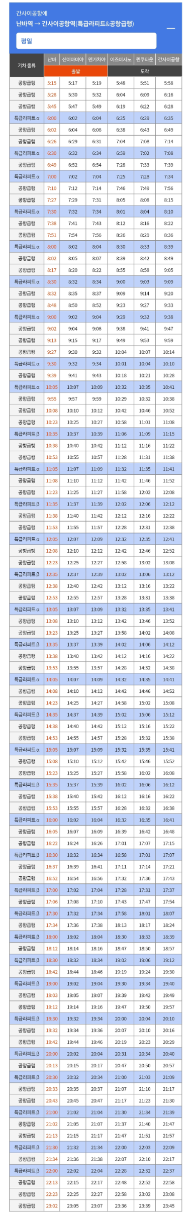 특급라피트 열차 시간표(간사이공항 -> 난바)