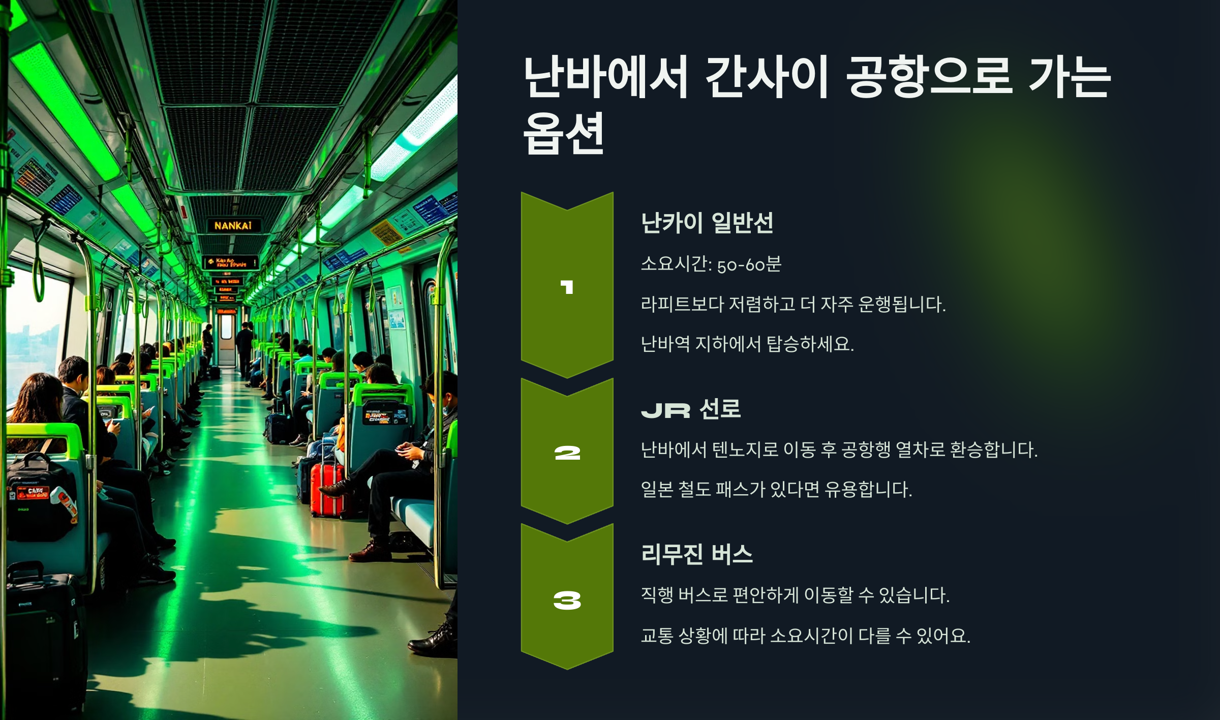 2. JR 선로: 난바 역에서 JR 선을 이용해 텐노지역으로 이동한 후, 간사이 공항행 JR 열차로 갈아탈 수 있습니다.