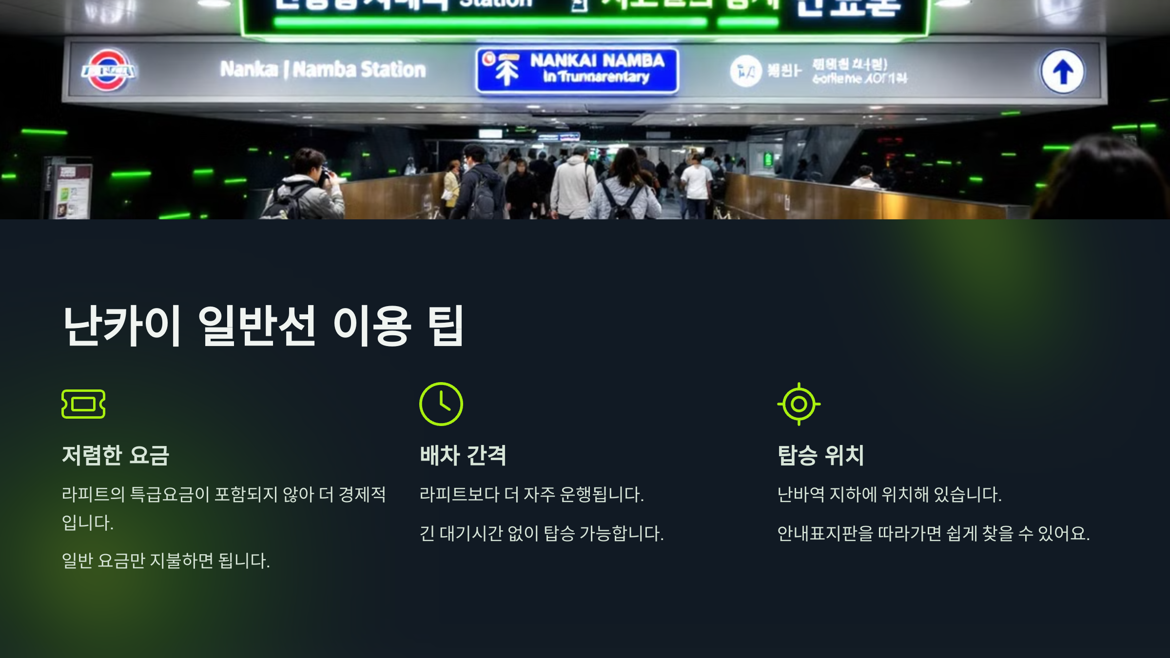 - 난카이 일반선: 약 50-60분 소요, 라피트(약 35분)보다 느리지만 더 저렴합니다.
