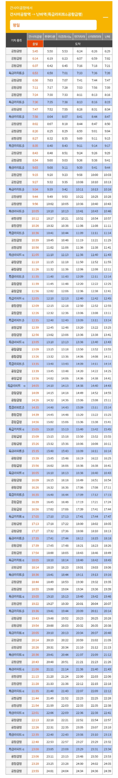 특급라피트 열차 시간표(난바 -> 간사이공항)