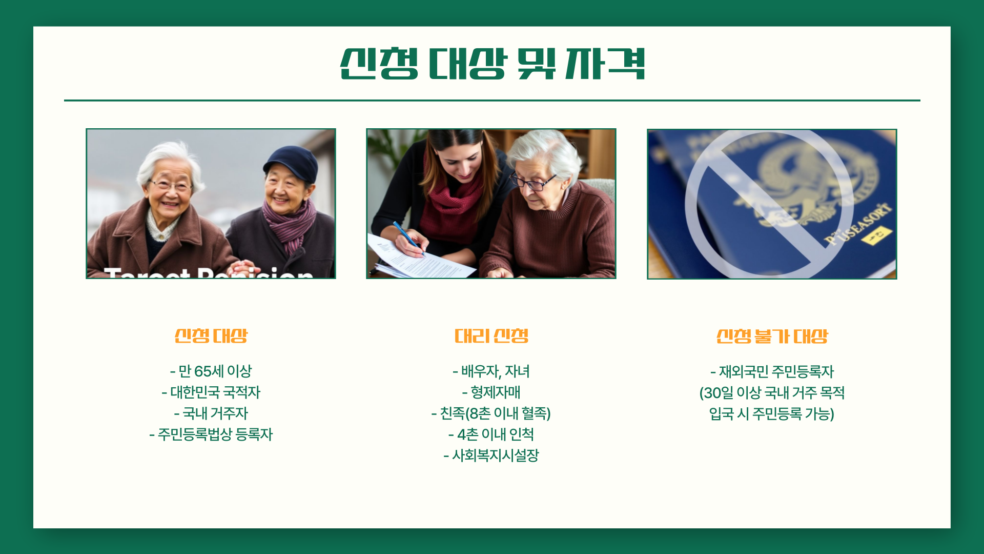 만 65세 이상의 대한민국 국적을 가진 어르신 국내 거주자 (주민등록법 제6조 1, 2호에 따른 주민등록자) 대리 신청