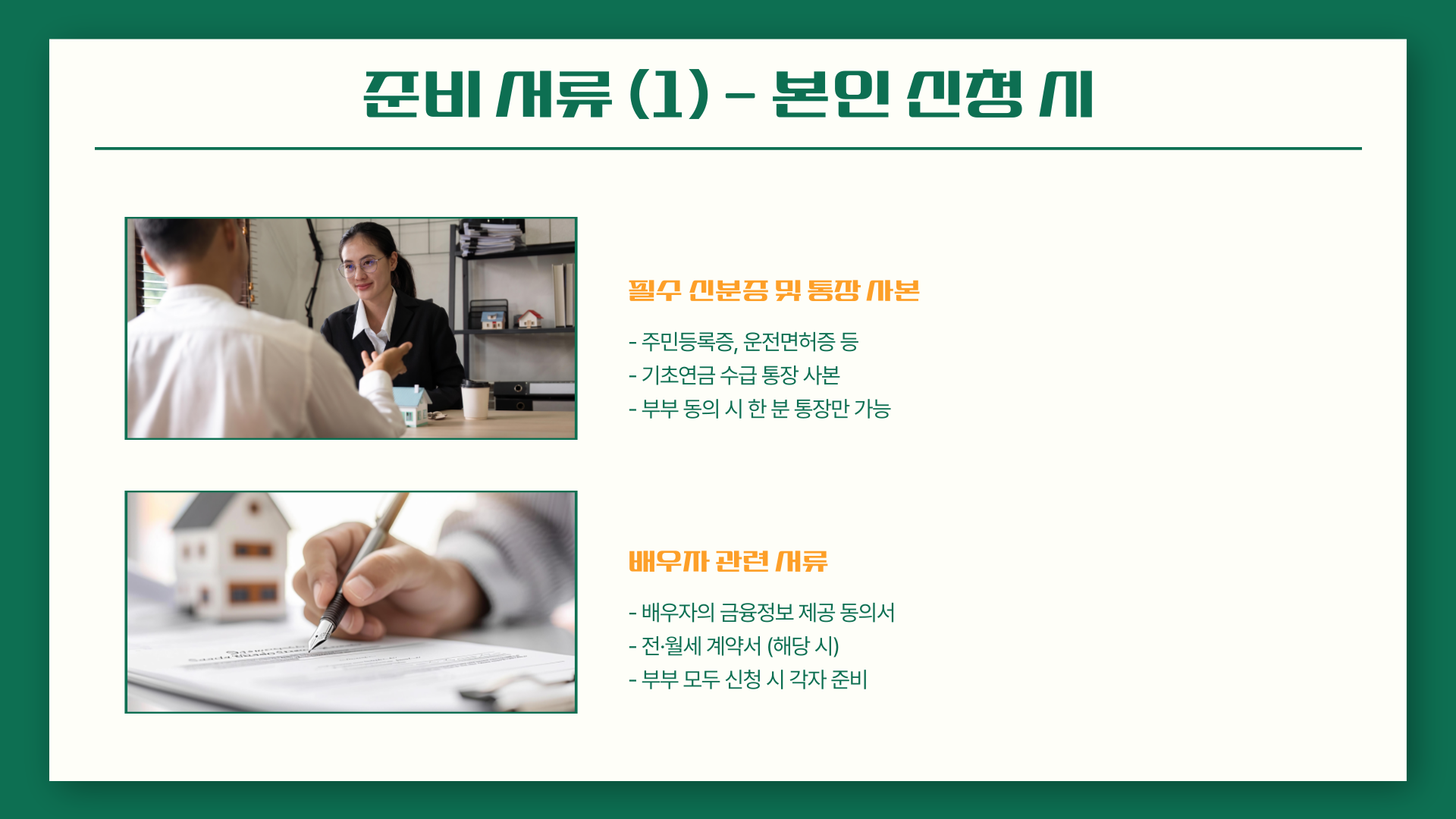 신분증 (주민등록증, 운전면허증, 장애인등록증, 여권 등) 기초연금 지급받을 통장 사본 (본인 계좌) 부부가 모두 기초연금 수급 시, 부부 모두 동의하는 경우 한 분의 통장 사본만 제출 가능 배우자의 금융 정보 등 제공 동의서 (배우자가 있는 경우) 전·월세 계약서 (해당자에 한함)