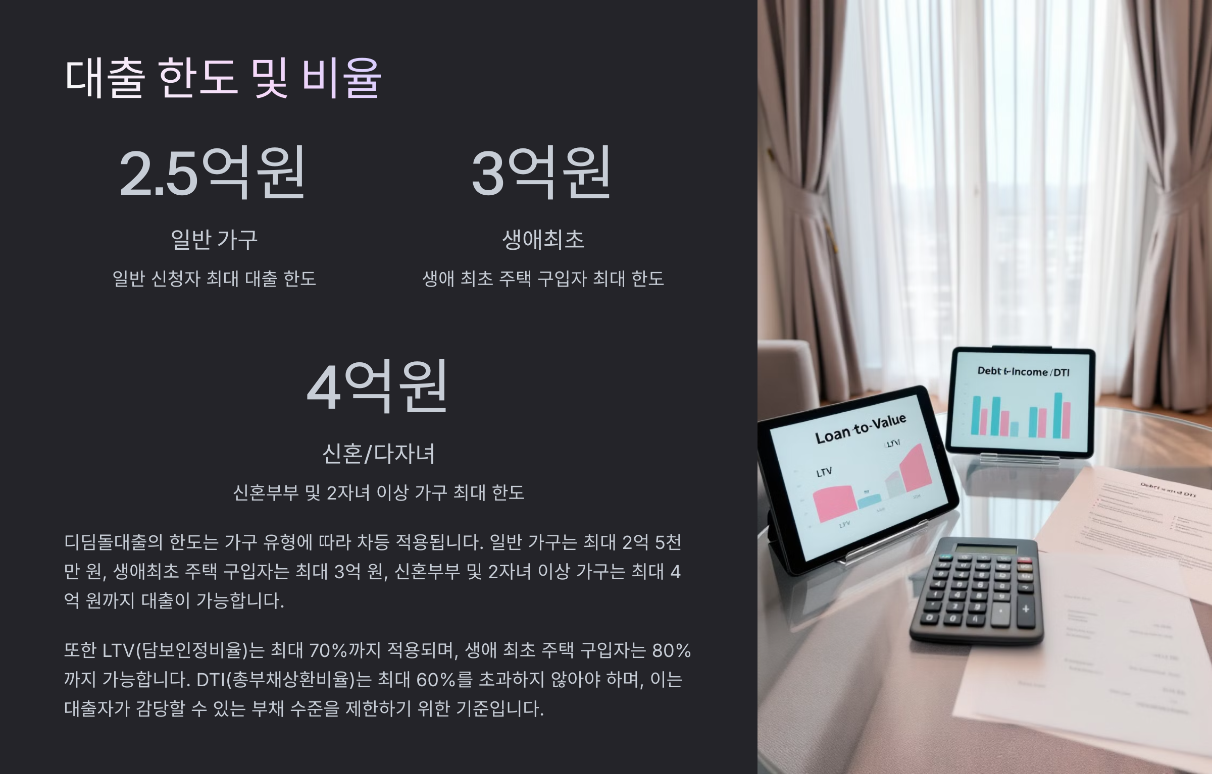 결론적으로, 디딤돌대출의 최종 한도는 위 요소들 중 가장 낮은 금액으로 결정됩니다. 따라서 신청 전 본인의 소득, 담보 주택의 조건, 기존 부채 등을 면밀히 검토하는 것이 중요합니다.
