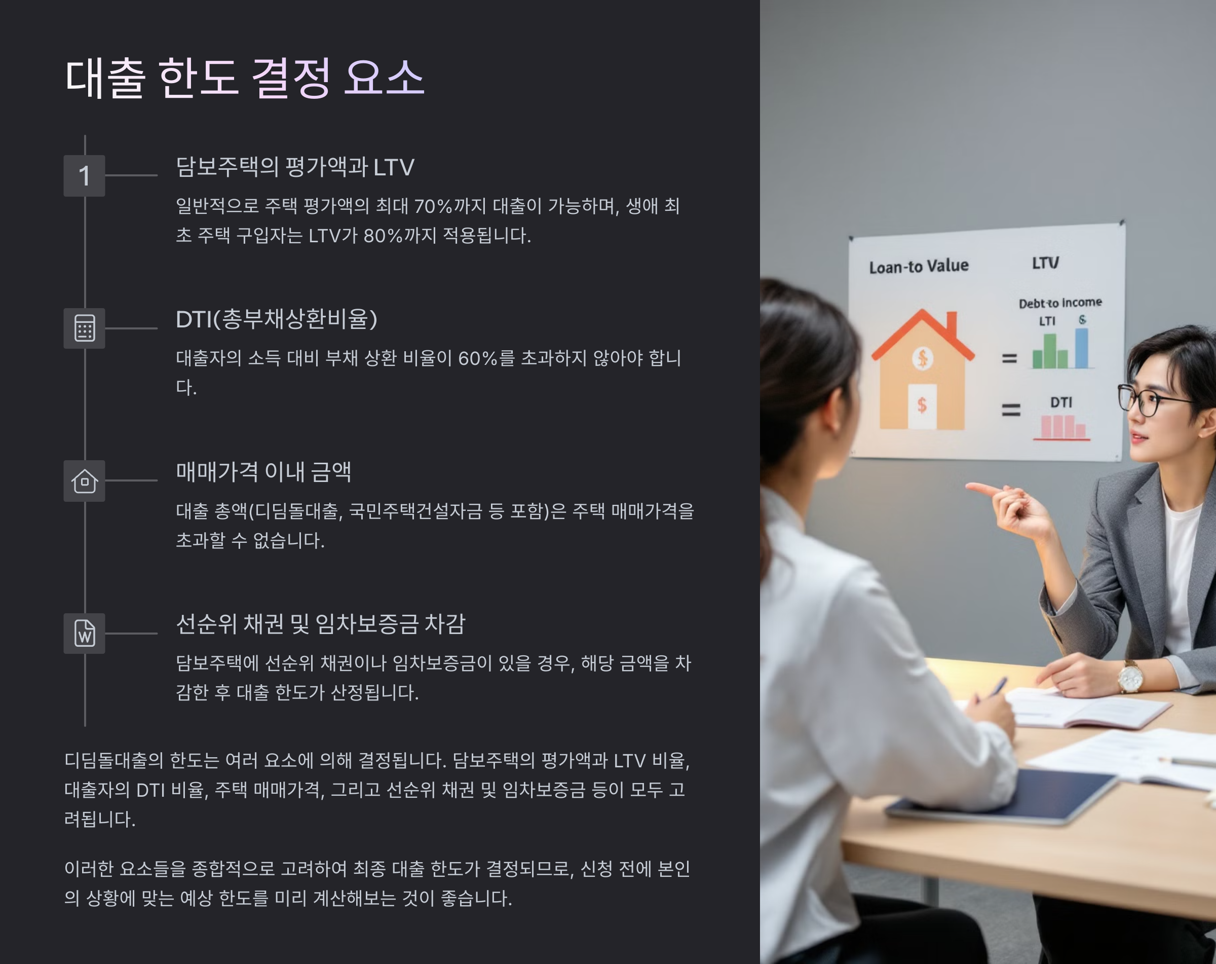 - DTI(총부채상환비율): 최대 60%