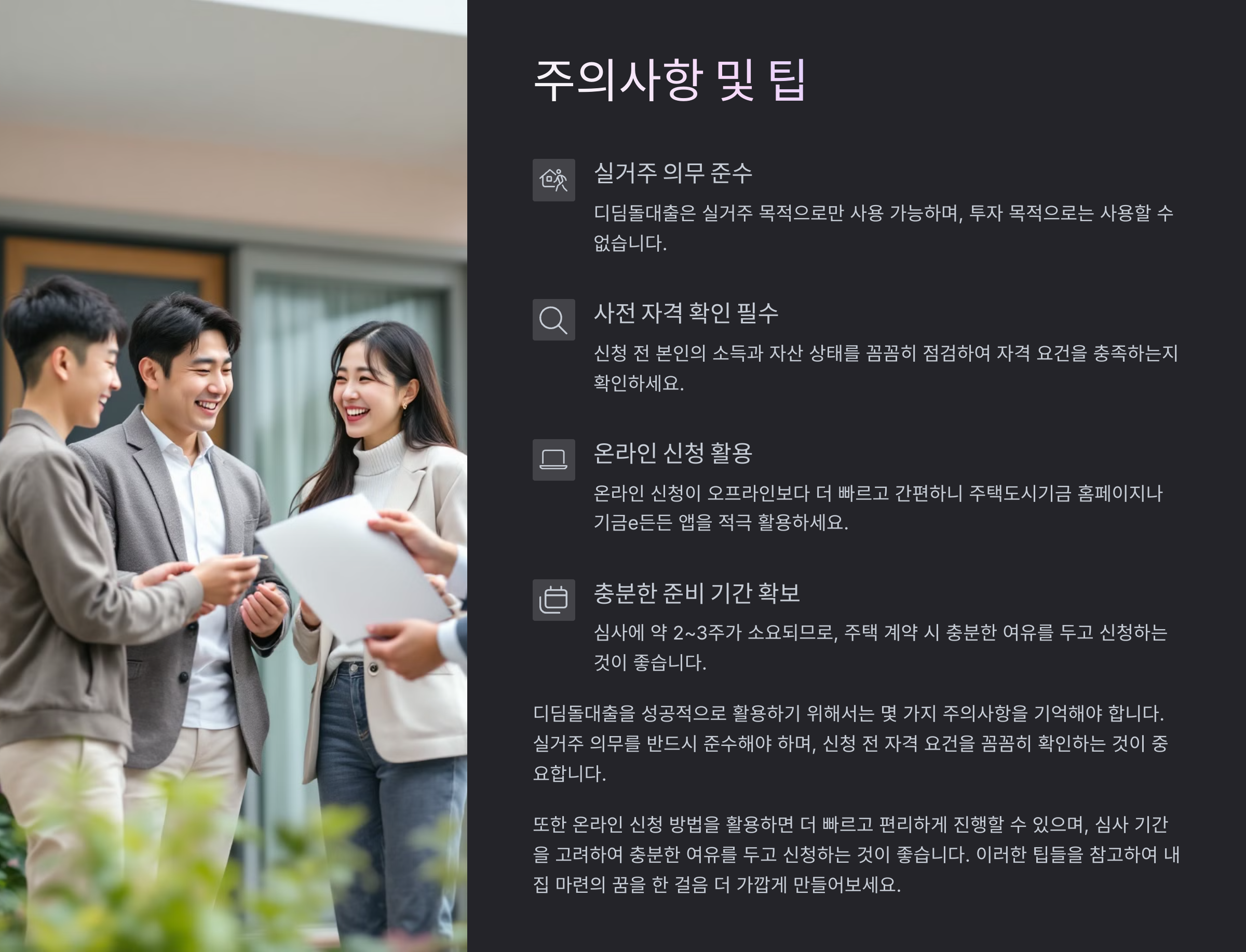 - 디딤돌대출을 받으려면 몇 가지 의무사항이 있어요