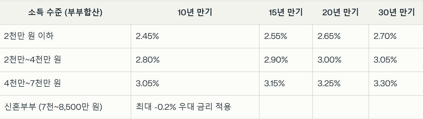 금리는 소득과 대출 만기에 따라 달라지며, 신혼부부나 다자녀 가구는 우대 금리가 적용됩니다.