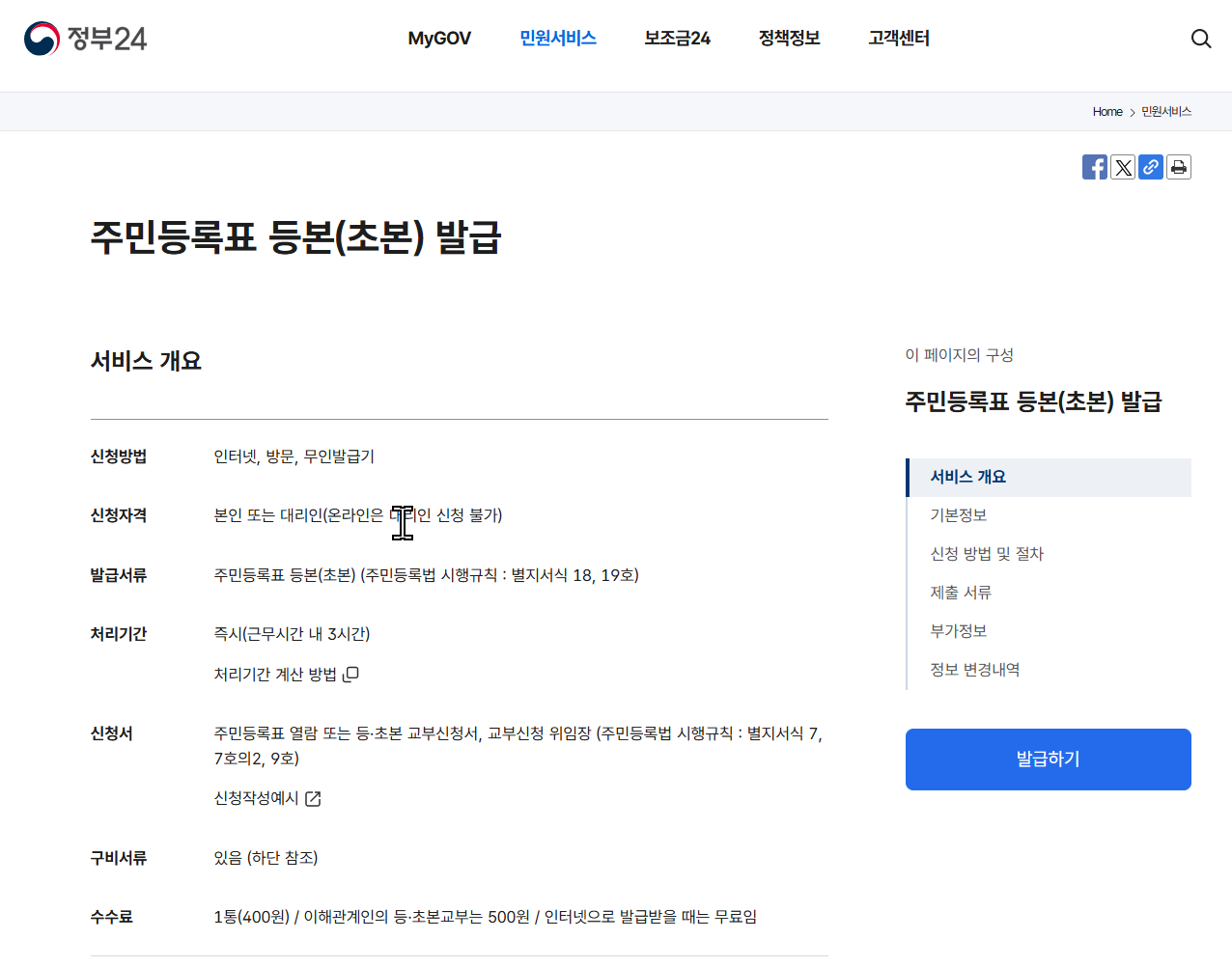1통(400원) / 이해관계인의 등·초본교부는 500원