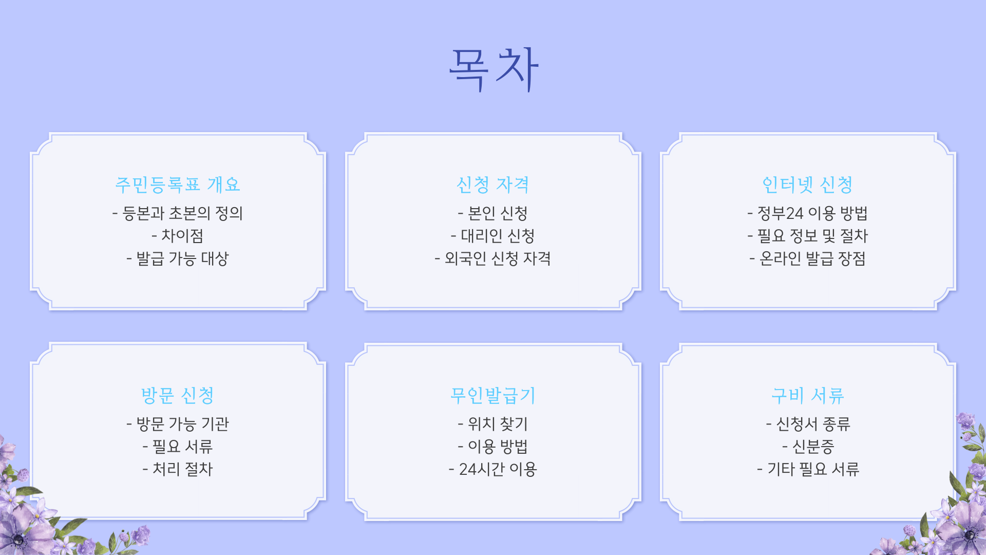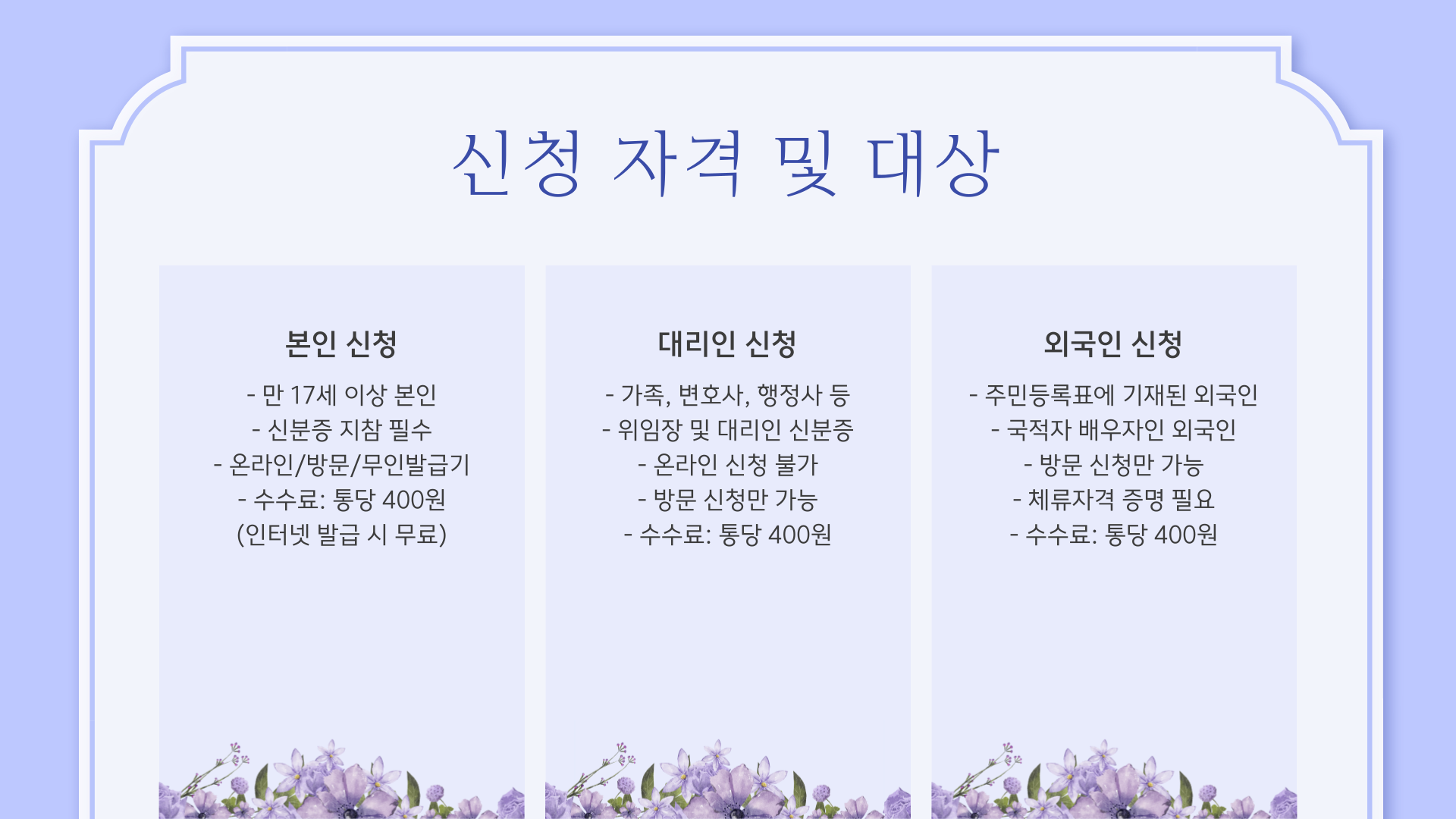 주민등록표 등본에는 한 세대의 모든 구성원의 주민등록 사항이 표시되고, 주민등록표 초본에는 한 사람의 자세한 주민등록 사항이 표시됩니다.