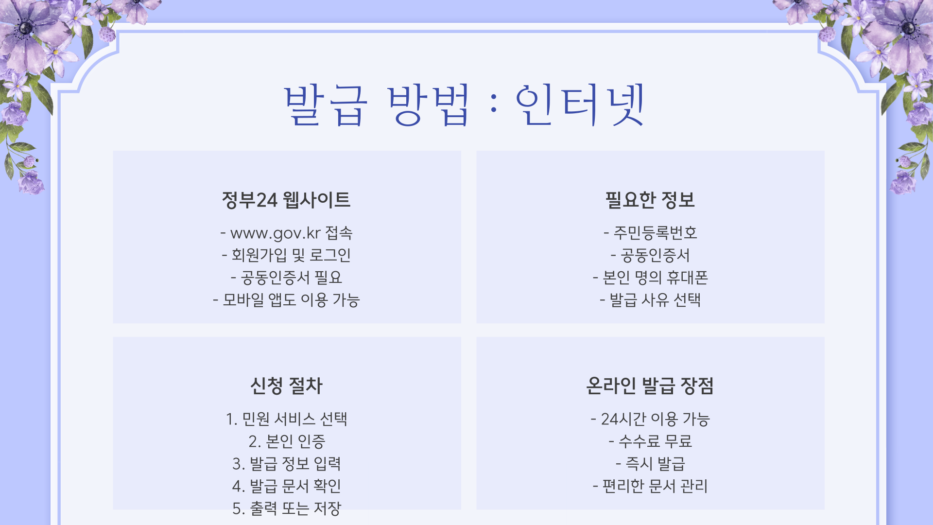 본인 또는 대리인(온라인은 대리인 신청 불가) 발급서류