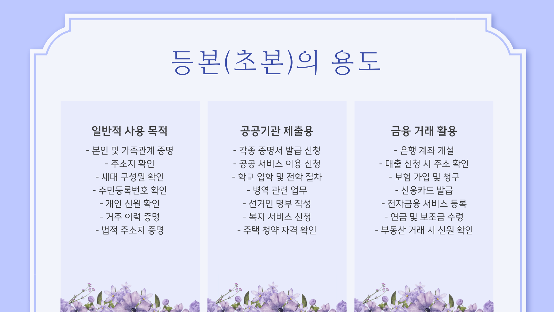 등본의 용도는 표를 참고 하기 바랍니다