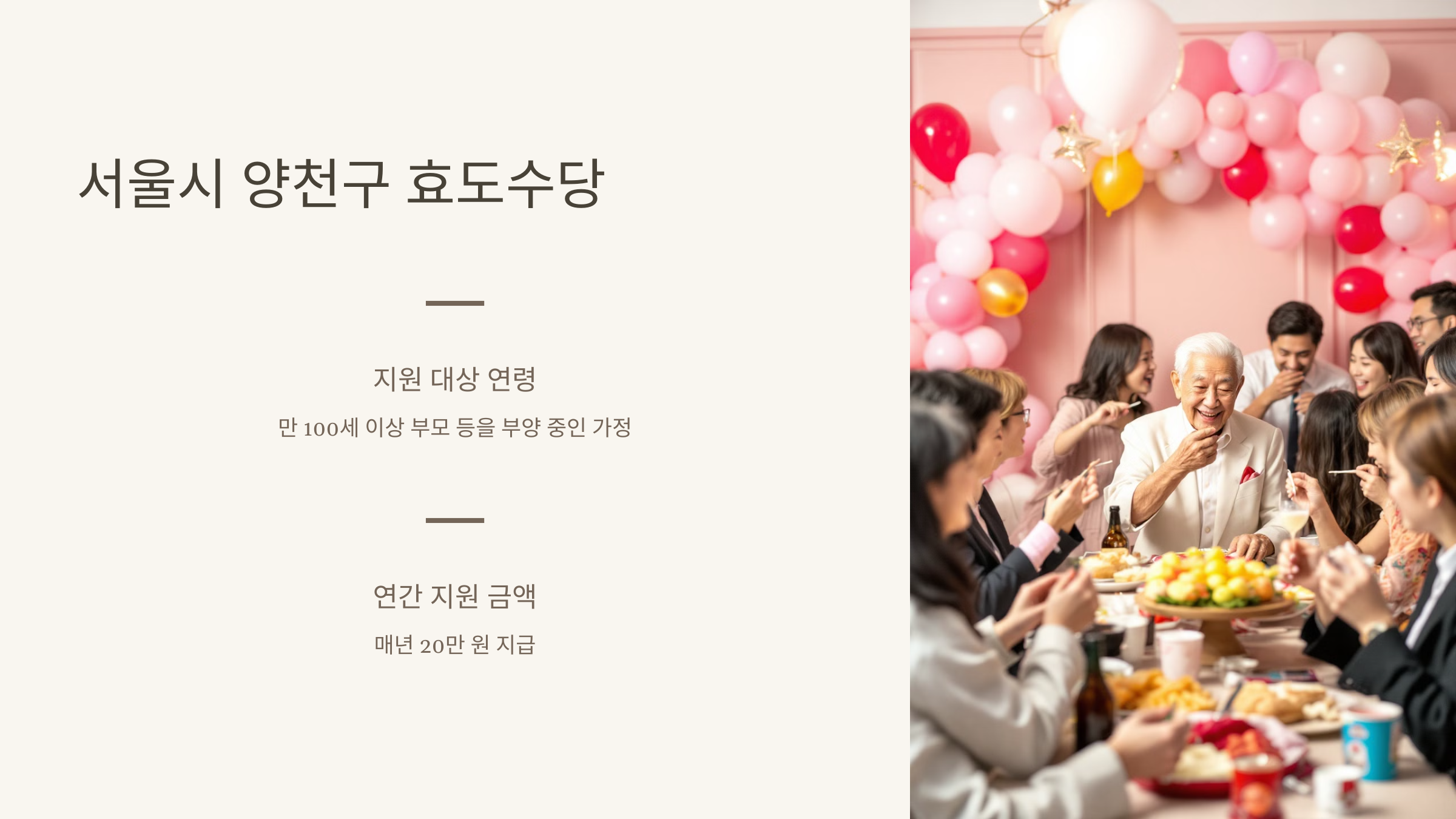 양천구는 만 100세 이상 부모 등을 부양 중인 가정에 매년 20만 원을 지급합니다.
