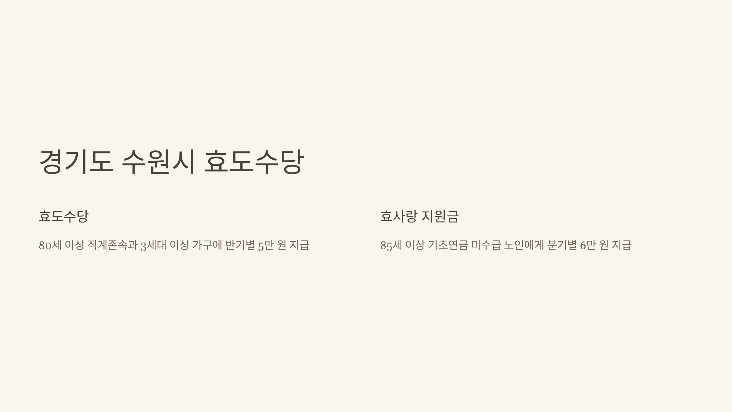 수원시는 효도수당과 효사랑 지원금 두 가지가 있습니다.
