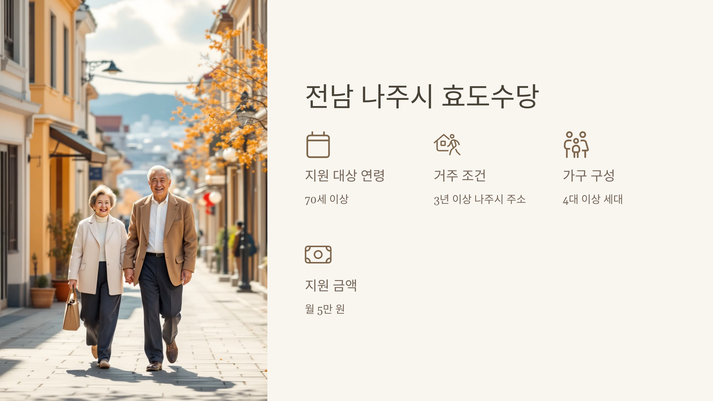 나주시는 70세 이상이고 3년 이상 나주시에 주소를 둔 4대 이상 세대에 월 5만 원씩 지급합니다.