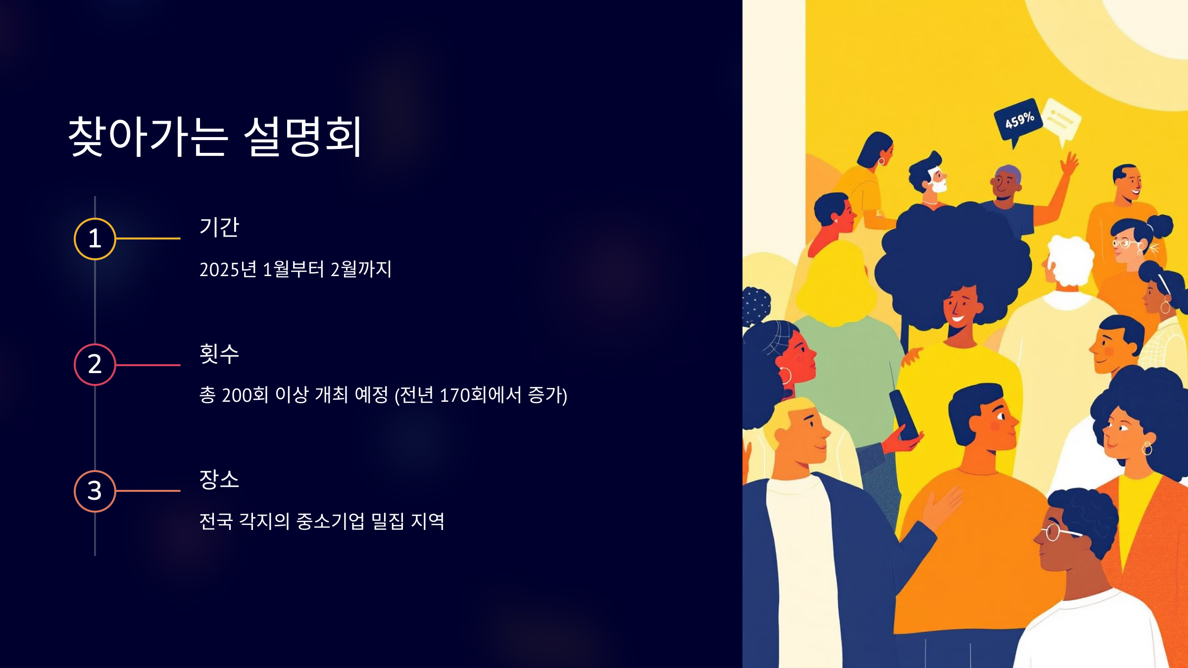 찾아가는 설명회: 1월부터 2월까지, 총 200회 이상 찾아가는 설명회 개최 문의: 중소벤처기업부 또는 각 지방중소벤처기업청 놓치지 마세요!