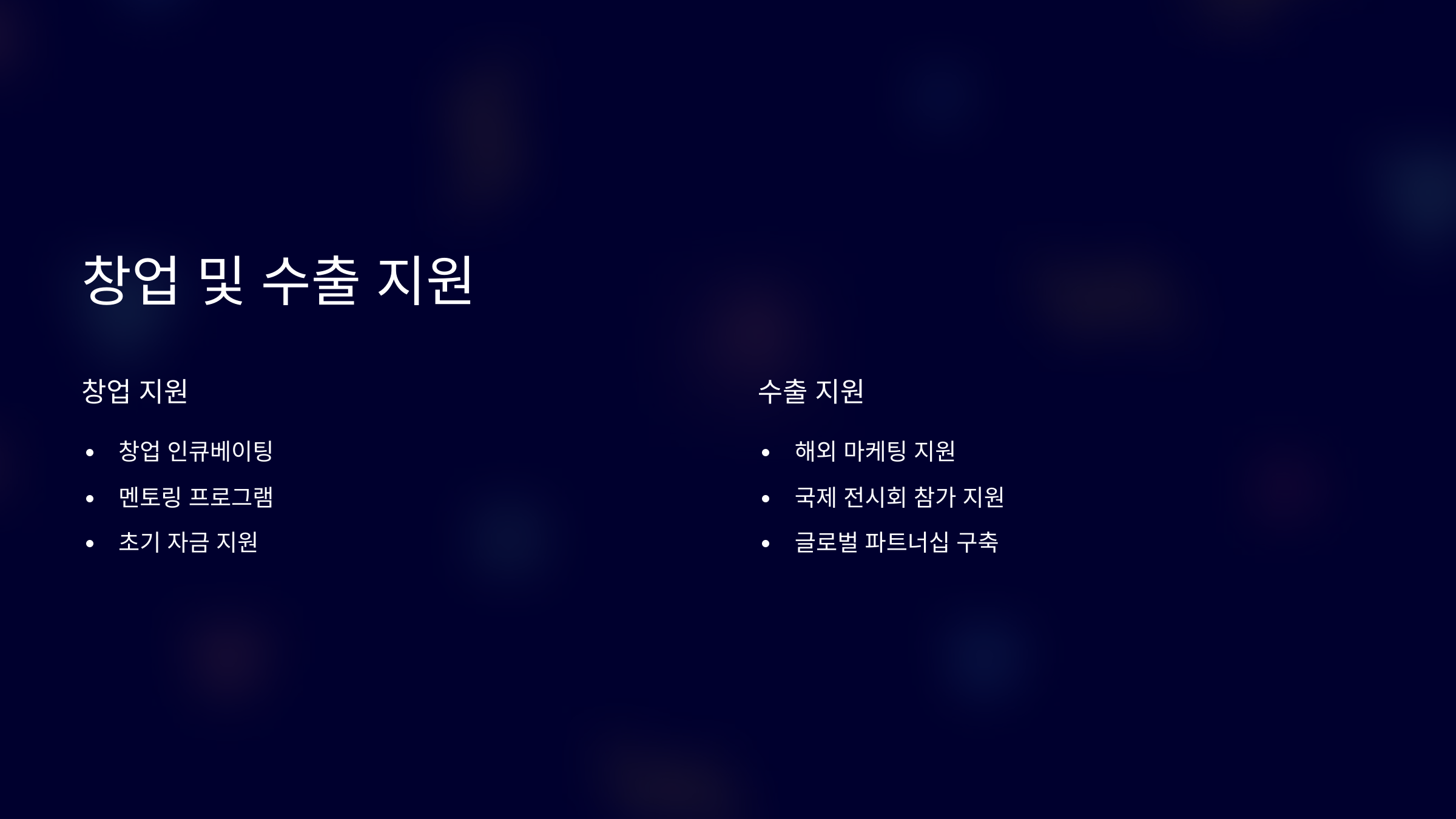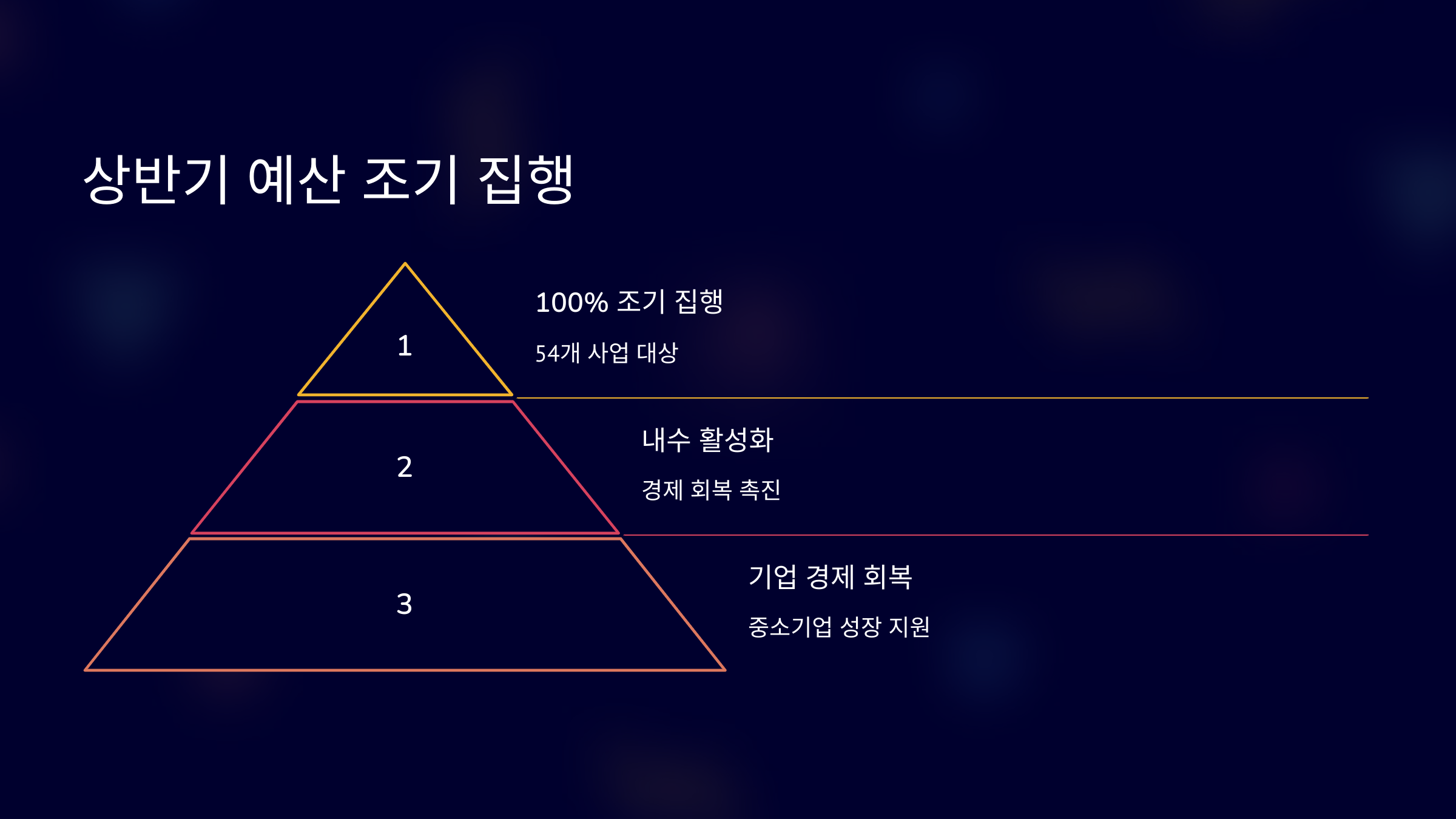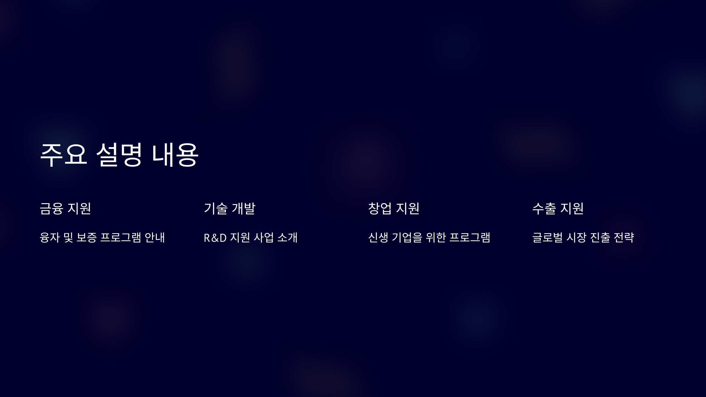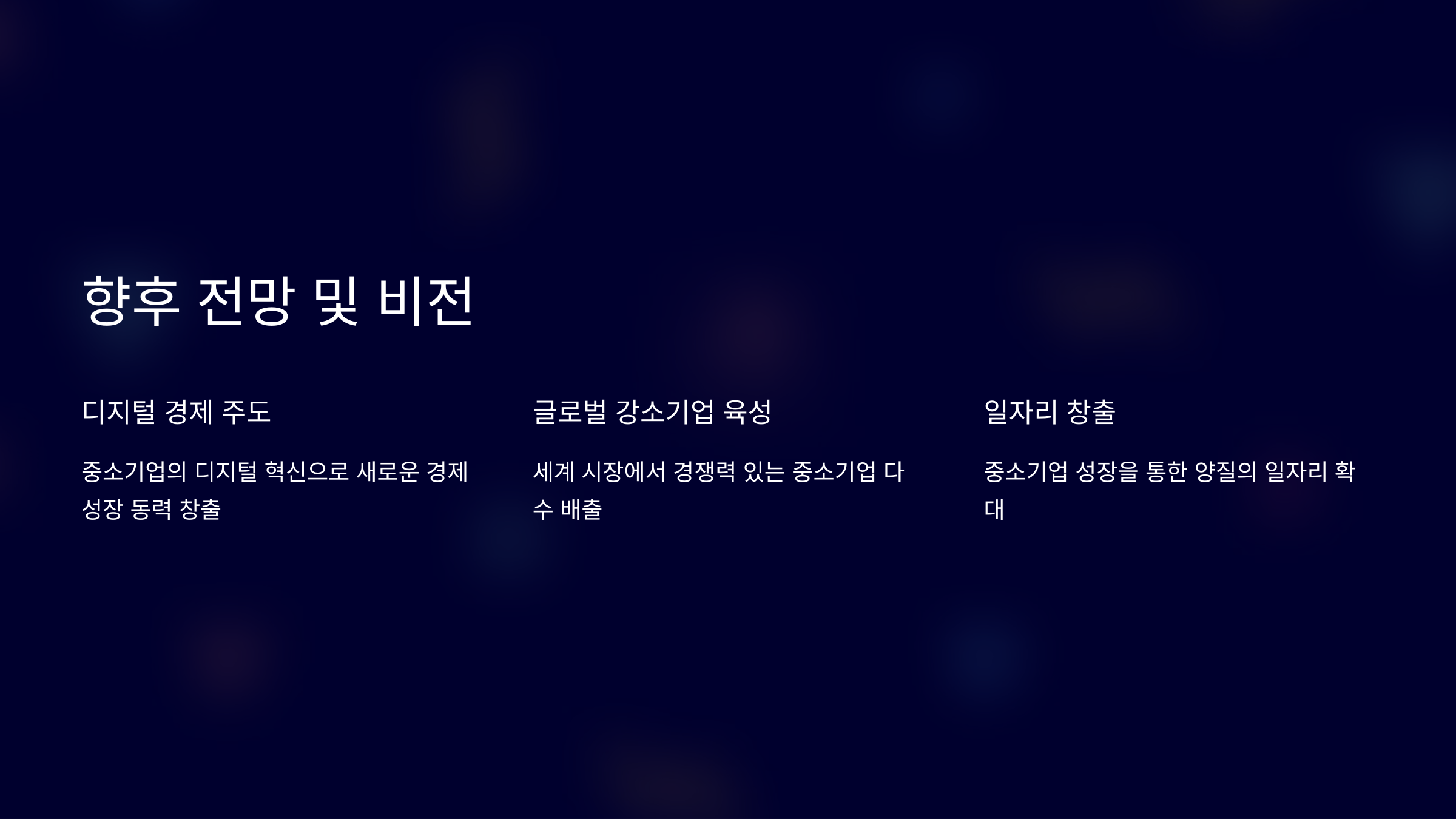 소상공인, 자영업자의 위기 극복 및 경영 안정 지원 중소기업, 벤처, 스타트업의 글로벌 도약과 혁신 성장 지원 지원 사업 적시 안내를 통한 기업 참여율 제고 주요 내용