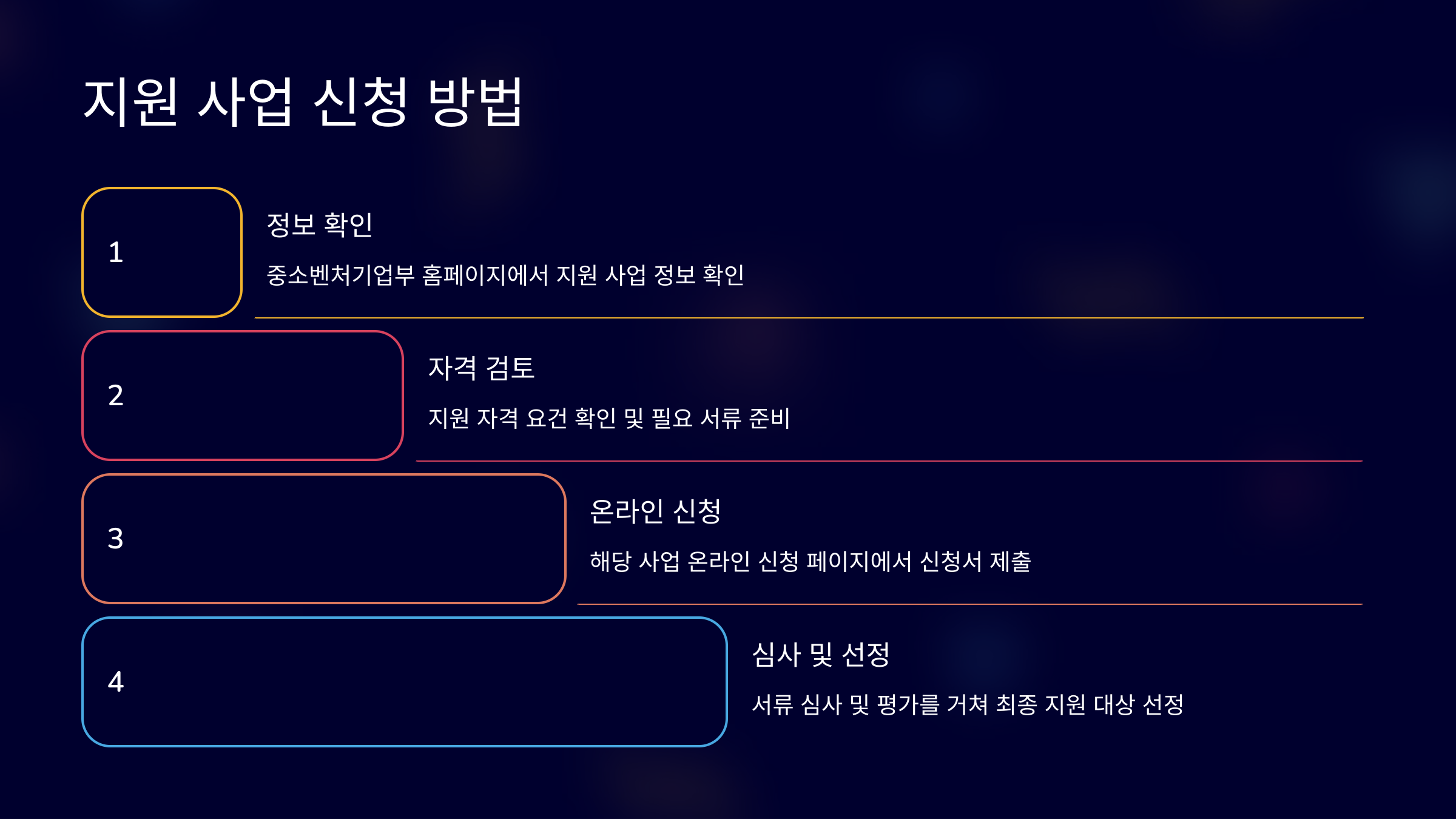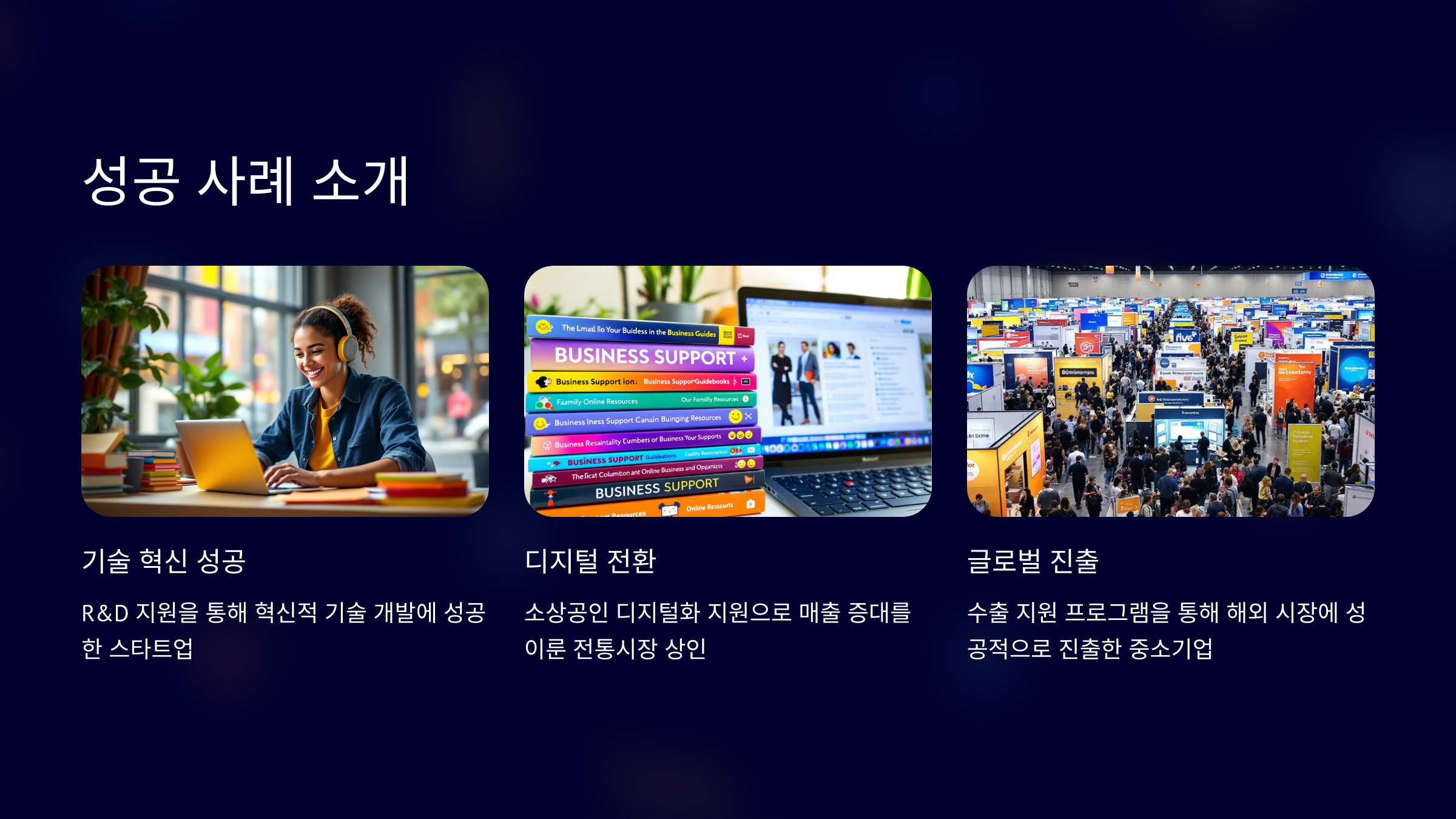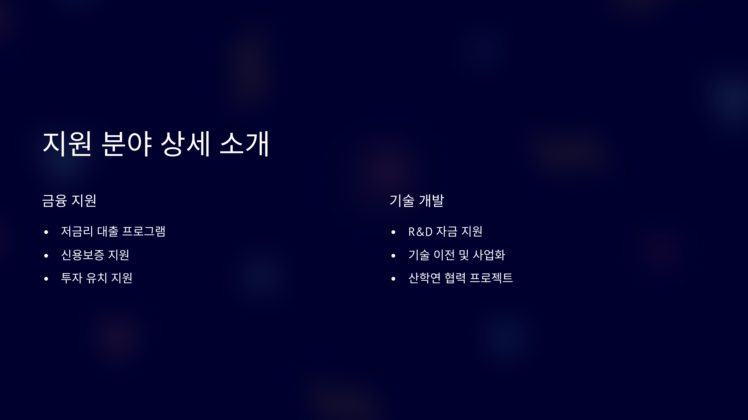 맞춤형 지원: 분야별, 대상별 맞춤형 지원 사업 안내 기회 포착: 몰라서 놓치는 지원 혜택 없이, 내 기업에 꼭 맞는 지원 사업을 찾아보세요!