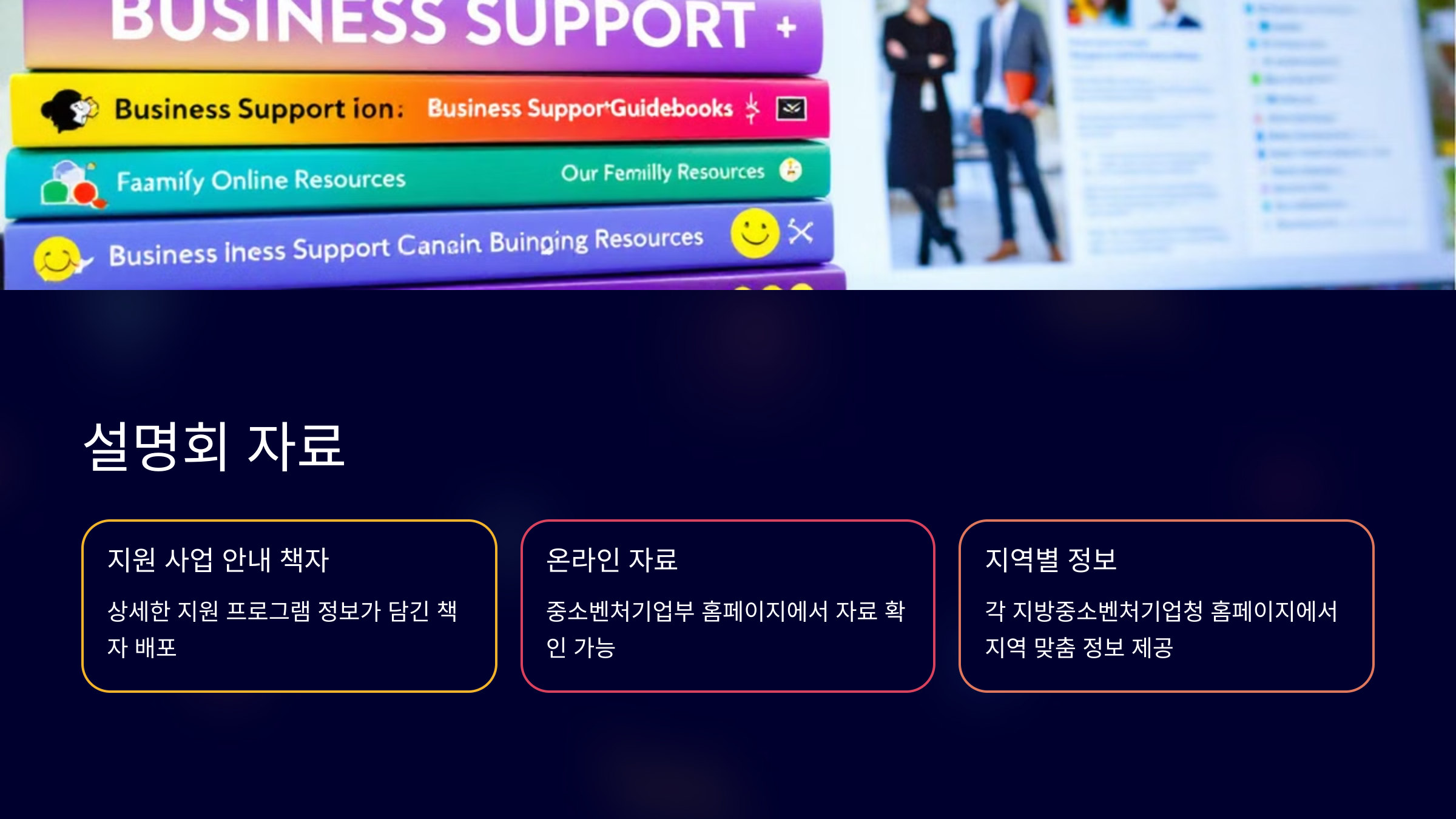 금융(융자, 보증), 기술 개발, 창업, 수출 등 주요 분야별 지원 사업 상세 설명 중소벤처기업 지원 사업 안내 책자 배포