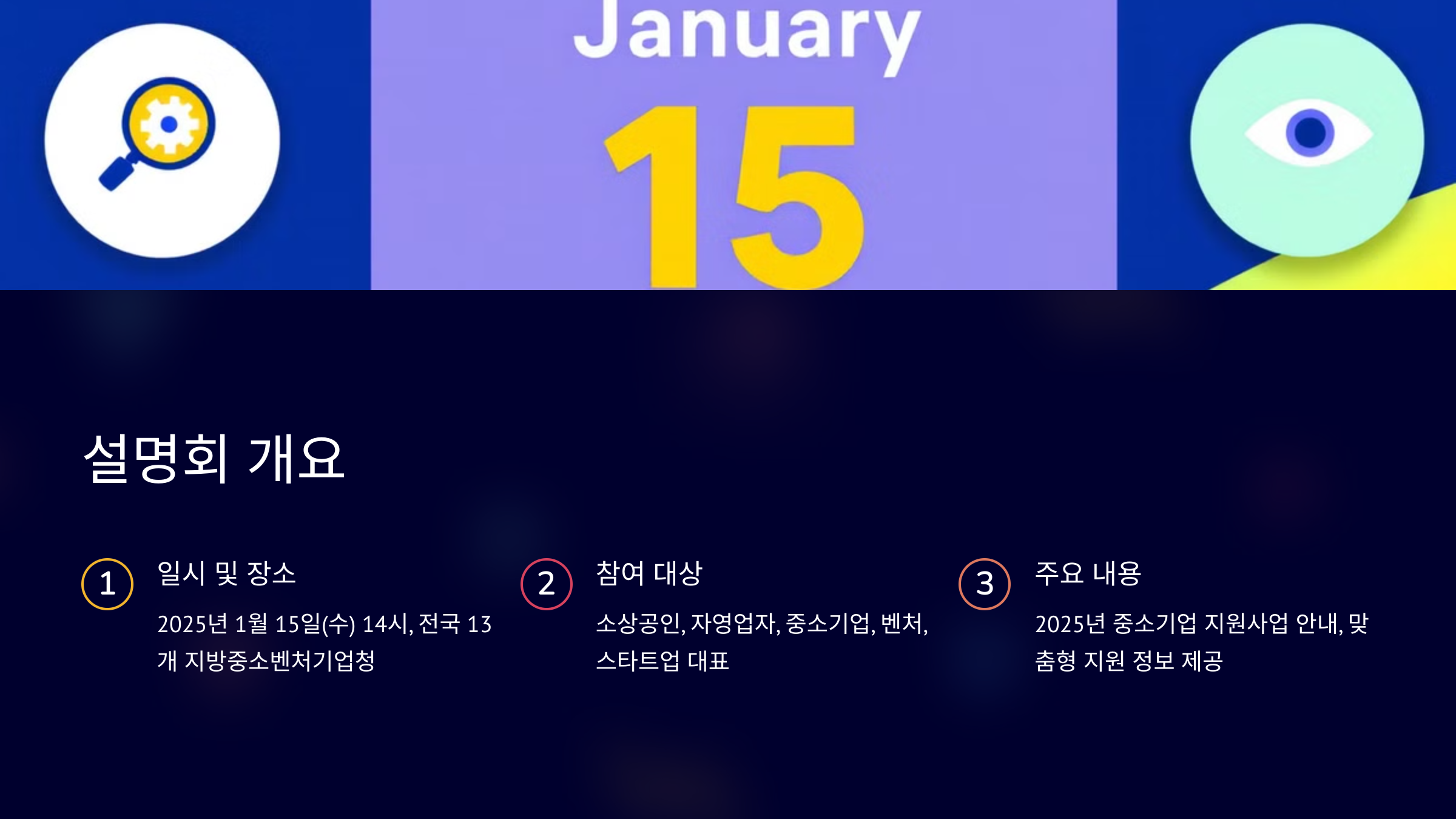 일시: 2025년 1월 15일(수) 14시 장소: 전국 13개 지방중소벤처기업청 또는 기타 장소 (지역별 상이)